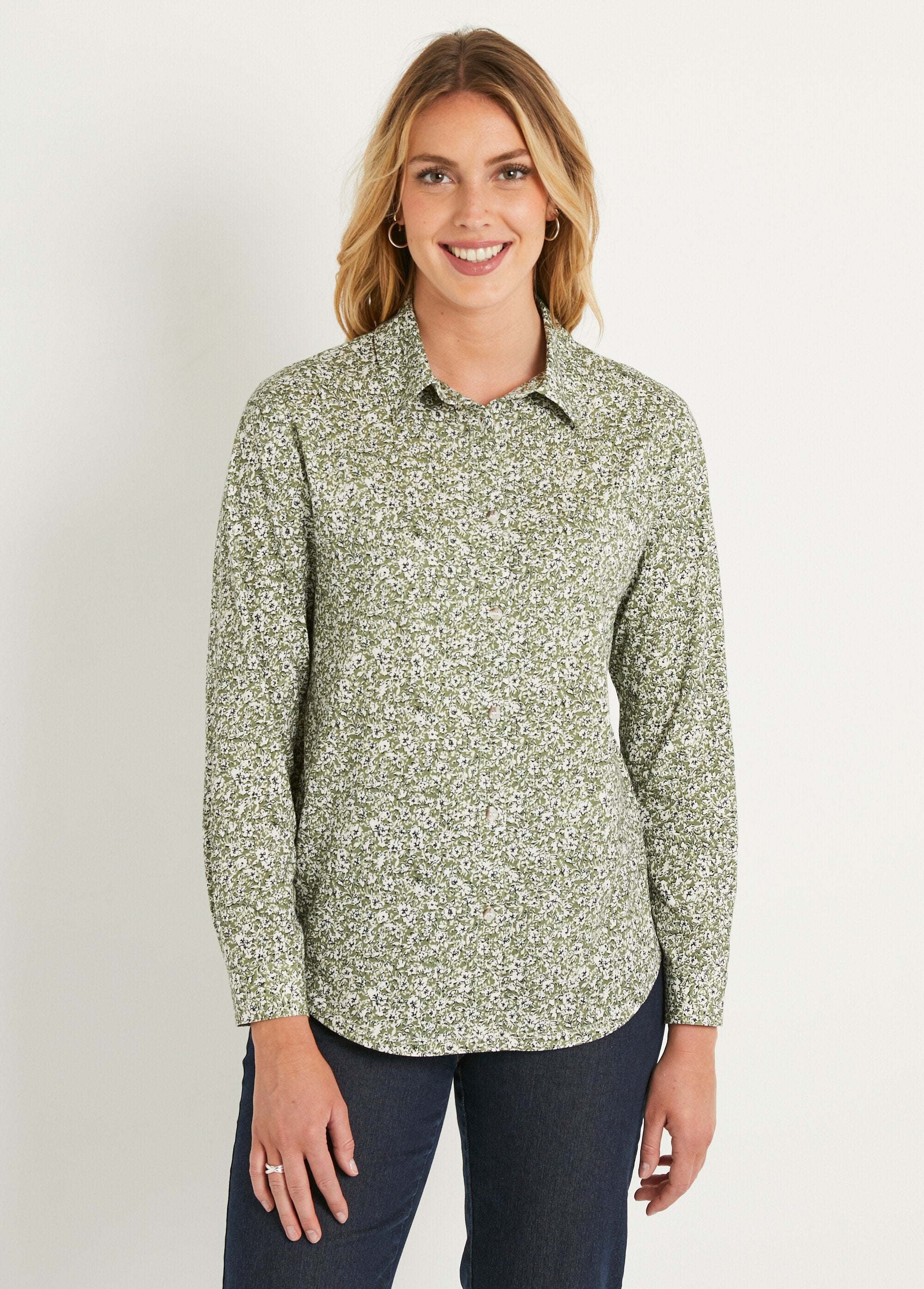 Esta blusa de suave algodón es perfecta para vestir a finales de verano. Su estampado floral y su corte clásico se combinan para darte un cómodo y colorido toque desenfadado. Con cuello camisero, tapeta de botones, manga larga, puños abotonados, canesú trasero y bajo ligeramente redondeado.