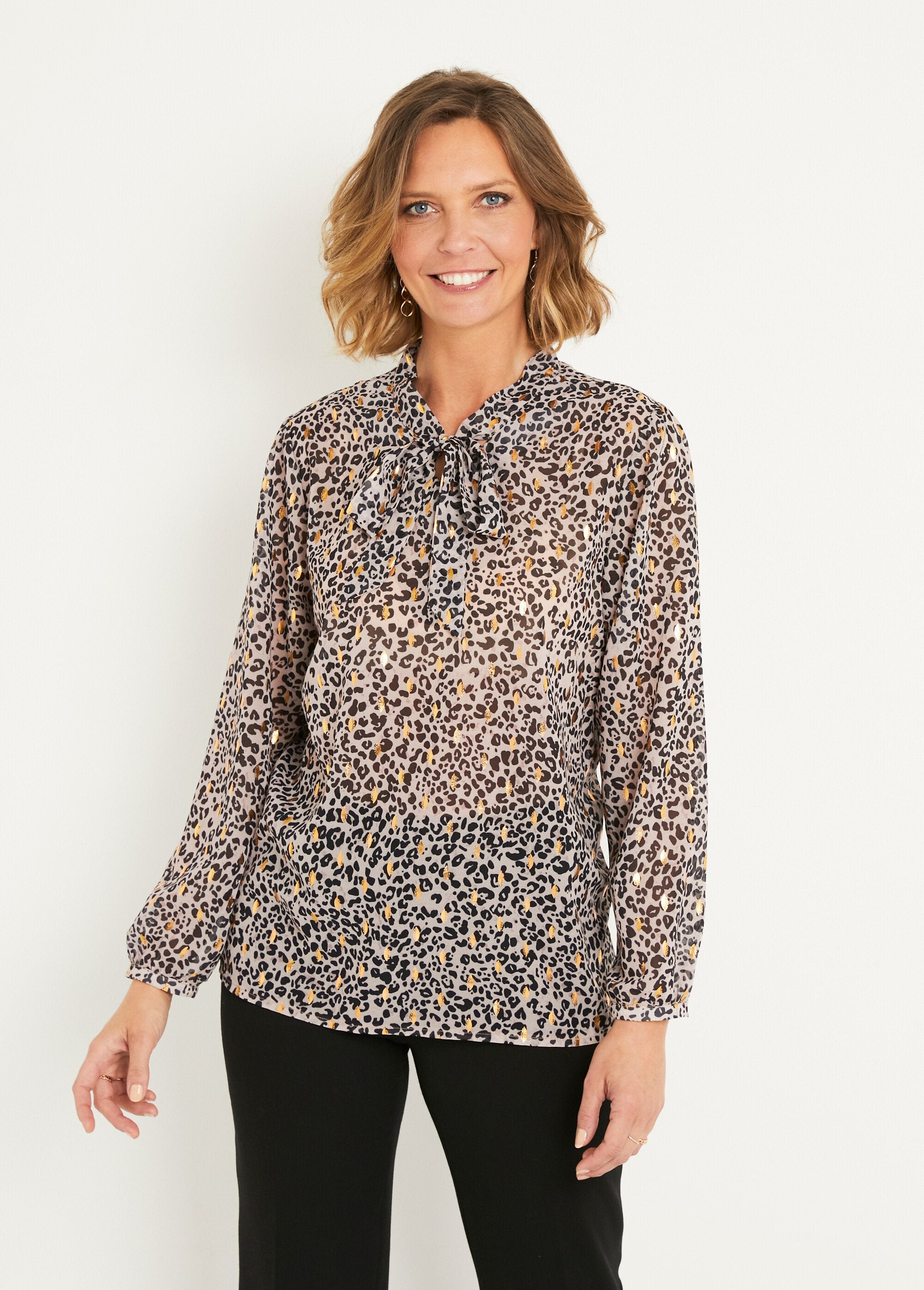 Con su brillante estampado de leopardo, la túnica aporta un aire ultra chic a la silueta. Con su forma acampanada, es ideal tanto para tallas pequeñas como para tallas grandes. Su escote en pico se realza con un pliegue delantero que le da volumen y un lazo de lavallière que le aporta estilo. Mangas largas ajustadas en un tirante. Bajo recto.